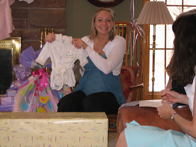 The guest of honor opening all of her gifts. Madelyn will be one well-dressed little girl since many people couldn't resist buying some of the adorable little girl clothes. She got dresses, panties, rompers...and even a robe with matching slippers to use after she takes a bath in her baby spa (seriously! Michelle even got a baby whirlpool tub!).