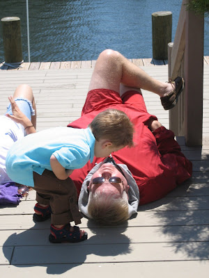 Gary and Andrew took Ben to sit on their boat but could not bring it into the water since the battery died at the last minute. Ben enjoyed sitting on it and looking out over the water regardless.